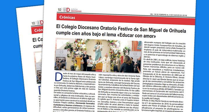 EL COLEGIO DIOCESANO ORATORIO FESTIVO DE SAN MIGUEL DE ORIHUELA CUMPLE CIEN AÑOS BAJO EL LEMA “EDUCAR CON AMOR” Desde el mes de mayo del pasado año y hasta la próxima fiesta de María Auxiliadora, el Colegio Diocesano Oratorio Festivo de San Miguel está celebrando su centenario. En toda la diócesis y especialmente en Orihuela, […]