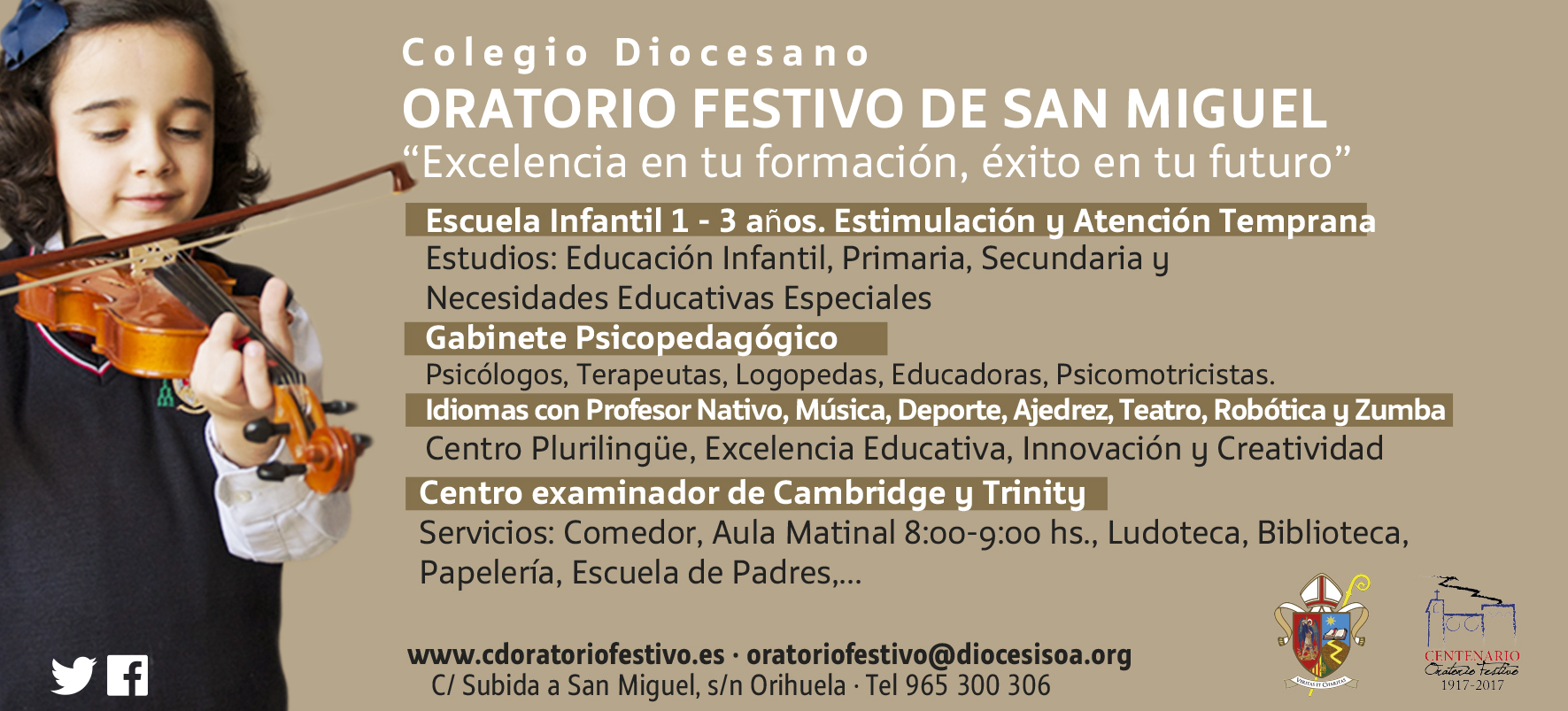 Un Proyecto Educativo, que abarca desde infantil de 1 año hasta 4º de Educación Secundaria Obligatoria y unos resultados que marcan la diferencia hacen de este colegio un pionero y vanguardista en innovación educativa, en una pedagogía de excelencia, en la enseñanza de idiomas, en creatividad, en métodos de trabajo y en la educación personalizada de todos sus alumnos. Entre otros muchos logros, el Oratorio ha sido reconocido oficialmente como Centro Plurilingüe, Promotor de la Actividad Física y la Salud, de Calidad Educativa, que emprende y desarrolla proyectos de atención al desarrollo infantil, de estimulación sensorial y aprendizajes tempranos, de atención, inclusión y normalización de alumnos con dificultades de aprendizaje y/o Necesidades Educativas Especiales, y que lleva a cabo programas europeos como Euroscola, eTwinning y Erasmus+, por los que ha recibido sellos nacionales y europeos a la excelencia.
