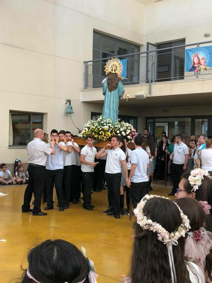 Lo más bonito de nuestro Colegio es el amor que los niños desde que inician su escolaridad en nuestro centro tienen a nuestra patrona. Ella, que siempre lo ha hecho todo, se merece lo mejor. Por eso, durante esta semana de celebración, nuestra Madre luce tan bonita con las flores que le ofrecen nuestros alumnos. También, como viene siendo tradición, los alumnos de 4º de ESO que finalizan estudios en nuestro Colegio son los encargados de colocar en sus andas la imagen de María Auxiliadora y de portarla en procesión el 24 de mayo, día de nuestra Patrona, después de la santa misa presidida por nuestro Sr. Obispo, y concelebrada por nuestro director titular y los tres directores titulares anteriores que han dirigido en las dos últimas décadas el Oratorio. Así, como desde hace cien años, ha salido nuestra Virgen en procesión al abrigo de su colegio y de su barrio para llenar de gracias y bendiciones las calles de Orihuela. A la finalización de la procesión y de vuelta al colegio, nuestra Madre es recibida con una hermosa petalada de flores entre vítores, aplausos y lágrimas de emoción. Para finalizar las actividades de celebración del mes de mayo dedicado a nuestra Madre, el día 24 de mayo, por la tarde, alumnos de primaria rezaron un Rosario infantil a María Auxiliadora. , organizado por el equipo de Pastoral del Colegio con mucho cariño y devoción. Seguro que las oraciones de todos ellos a nuestra madre darán sus frutos.