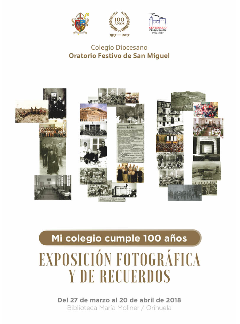 La biblioteca María Moliner de Orihuela acoge, desde su inauguración el 27 de marzo a las 13:00 horas y hasta el próximo 20 de abril, los cien años de vida de esta institución; en los que se muestran sus inicios, evolución, progreso, cambio y transformación en una exposición lineal en el tiempo. Además, se podrán visionar recuerdos y trabajos realizados por los alumnos y profesores a lo largo de los últimos cursos de preparación de la celebración del centenario, y que han servido para que todos conozcan la historia y la vida de su Colegio con un trabajo previo de búsqueda de información e investigación. Tampoco faltará la proyección digital de imágenes y vídeos, que va a proporcionar dinamismo a la exposición.